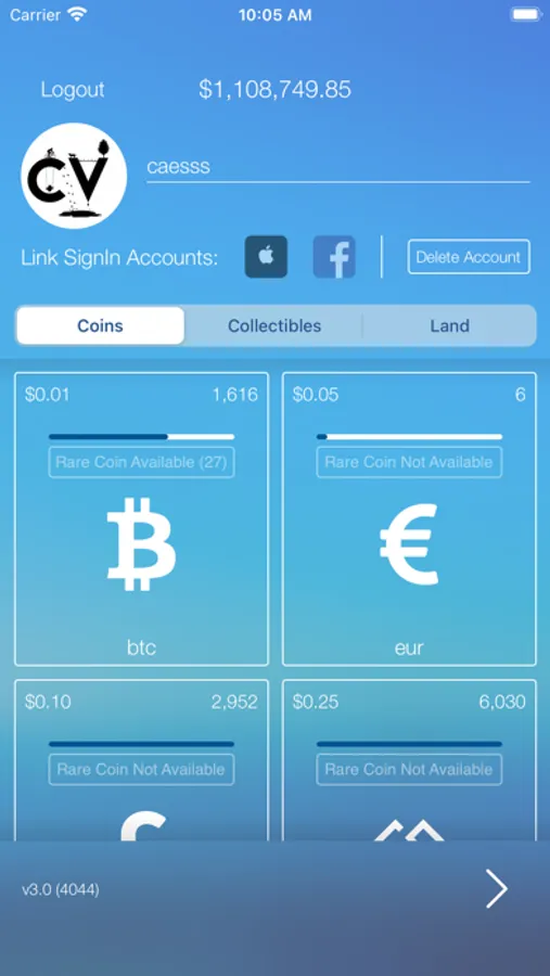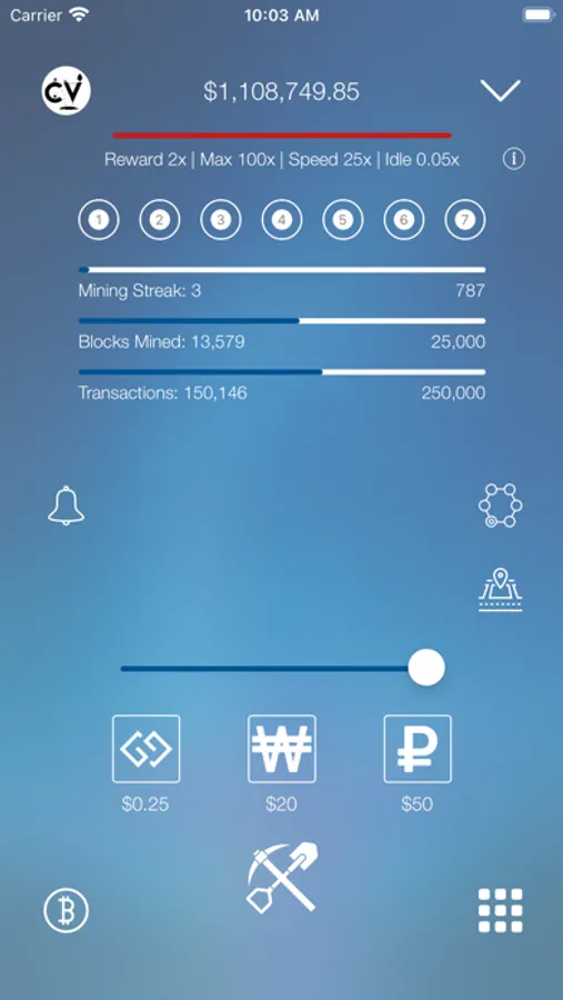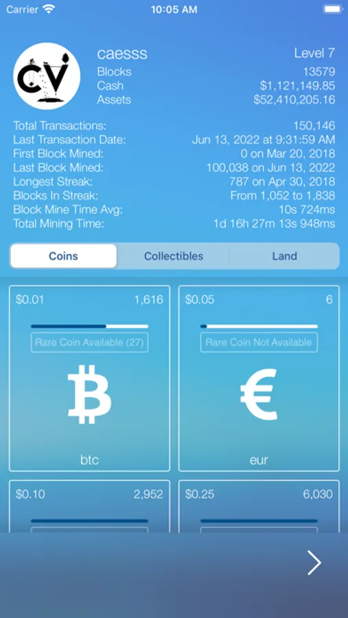 Play the cryptocurrency game the easy way. Start mining and build your fortune. Collect all the currencies by adding transactions, then sell them back for a profit to others in the game. Collect rare limited versions of coins generated at every 1000, 2500, 5000, 10000, 50000 block intervals. Leverage your cash, assets and rare coins to buy Virtual Land.