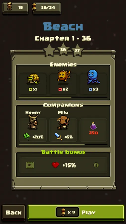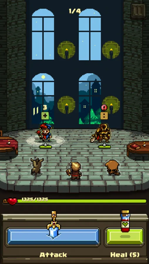 Acquire new companions to help you along in your journey. Each companion will grant you a boost to one of your hero's attributes like health, attack and luck. Choose your companions wisely before going into battle!