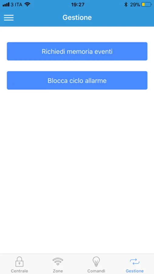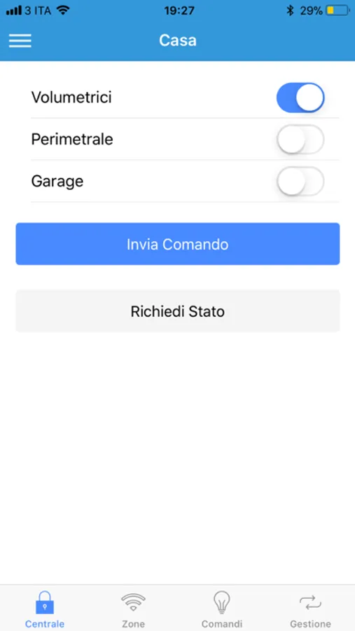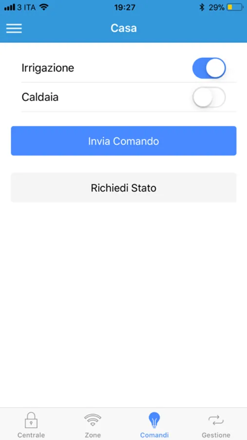 Il controllo avviene attraverso un'interfaccia utente che permette l'invio di opportuni comandi SMS verso la centrale; ad ogni comando ricevuto la centrale lo eseguirà e risponderà con un SMS di stato.