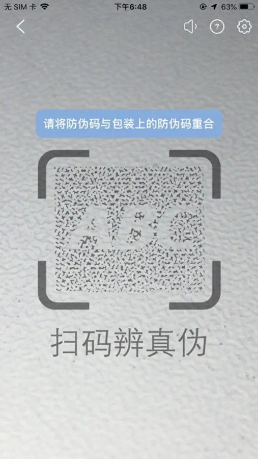用户在使用本软件扫描防伪码时,为确保真伪识别率,请移动相机镜头使要扫描的防伪码完全置于相机的取景框内。一般的手机有自动调焦功能,如果您的手机没有此功能,请手动点击屏幕定焦、或调整手机的高度,使得捕捉的图像更加清晰,并且保持手机稳定,方便识别。