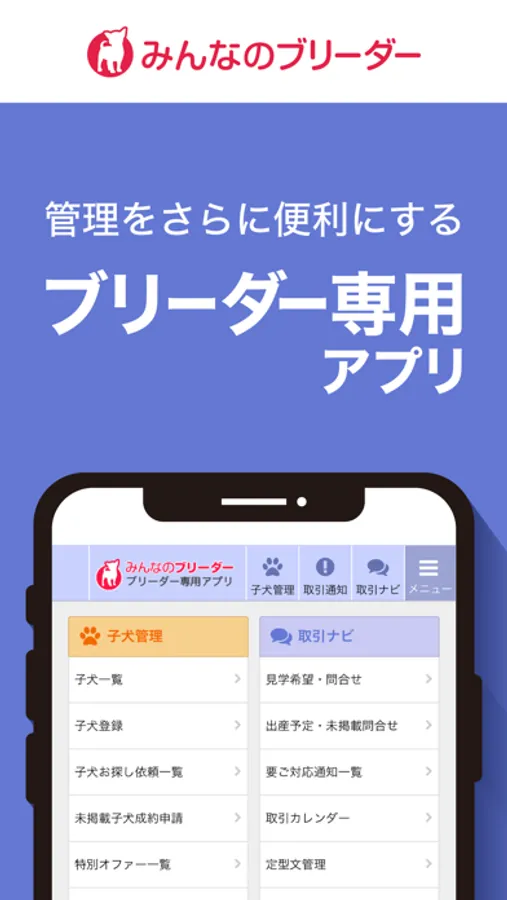 子犬をお迎えしたいお客様とブリーダーをつなぐ、国内最大級のブリーダー直販サイト『みんなのブリーダー』のブリーダー様専用アプリです。