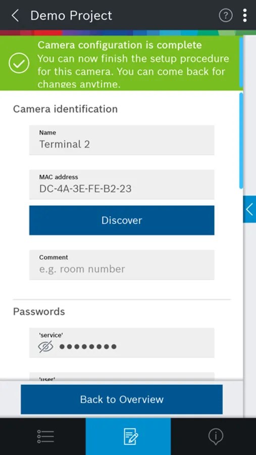 On site, those pre-configurations can simply be pushed onto the installed camera, making the installation and configuration procedure easier and less time-consuming. Previously configured cameras can be integrated and updated as well. The camera's field of view can be viewed and adjusted along with other image settings via the app itself. A comprehensive report of the commissioned cameras is automatically generated.