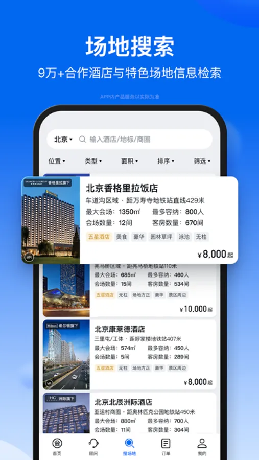 2.【海量资源,智能匹配】全国20000家会议酒店和70000个特色场地直连,对接专业的会议周边服务商。
