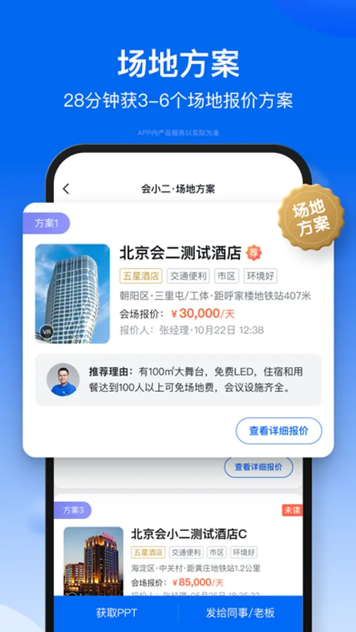 1.【高效便捷,省时省力】5秒提交需求,10分钟顾问致电,28分钟接收会场方案。