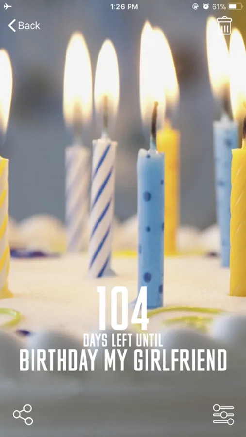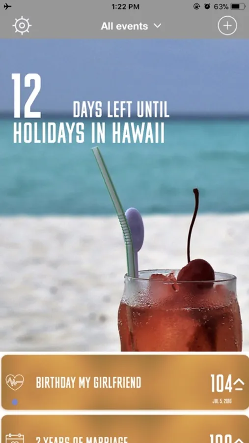 Countdown days left until important events and special dates in your life with this simple and easy-to-use event reminder app. Create a list of all significant events, set a beautiful background for each event and never again will you forget any important date. This countdown timer counts days left until your special events, so you can easily keep track of upcoming birthdays, holidays, anniversaries, appointments and so on.