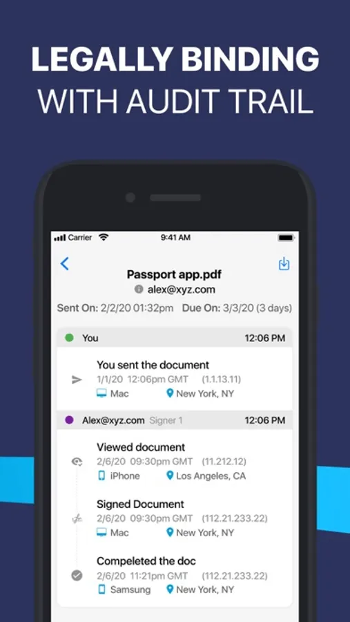 - Create and Request e-signatures from anywhere. Signatures are legally binding and have an audit trail.
