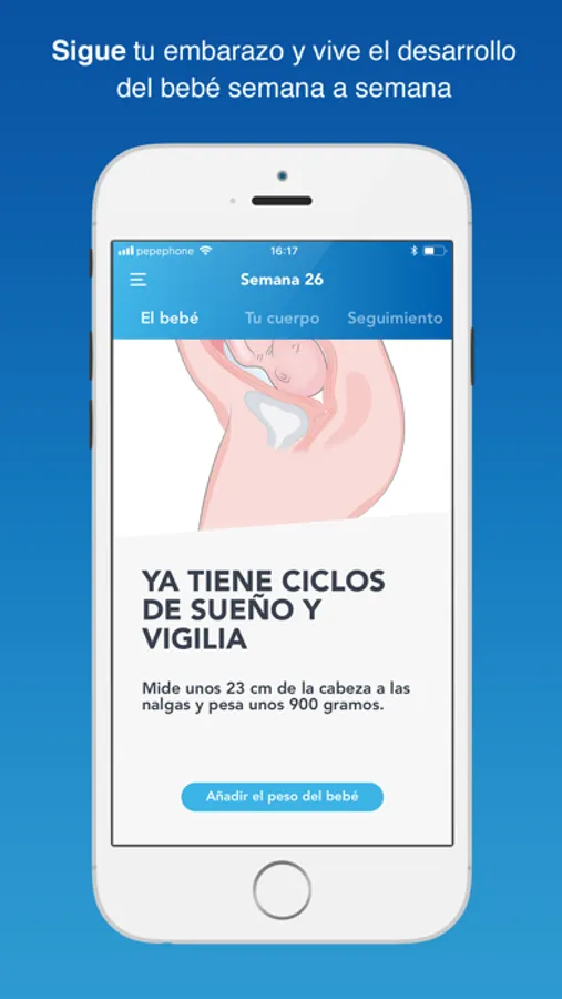 Crea tu perfil de embarazada, introduciendo la fecha de tu última regla, para que la app se actualice automáticamente semana a semana con información sobre el desarrollo del bebé, la evolución de los síntomas y sensaciones habituales del embarazo y las pruebas médicas más importantes. También te permite llevar un control de la evolución del peso materno y fetal.