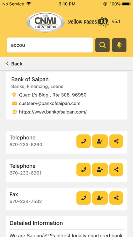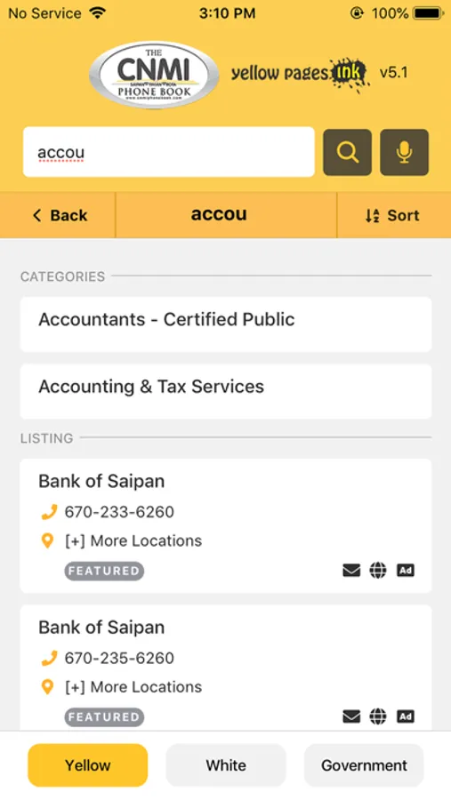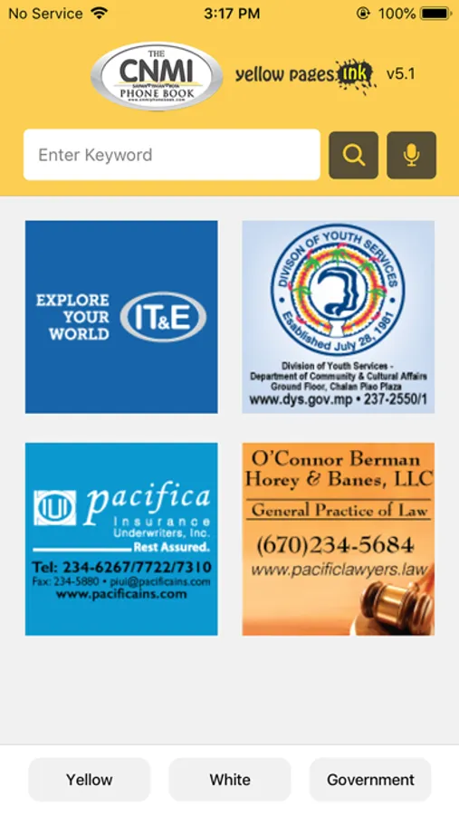 Search the Yellow/White/Government Pages for businesses in CNMI area. Access business addresses, phone numbers, websites, email, ads, coupons and other enhanced listing data of our participating publishers. Sort by distance to find the closest results or sort by relevance of your search term. View results in a list view. Shows direction of the business address from your current location.
