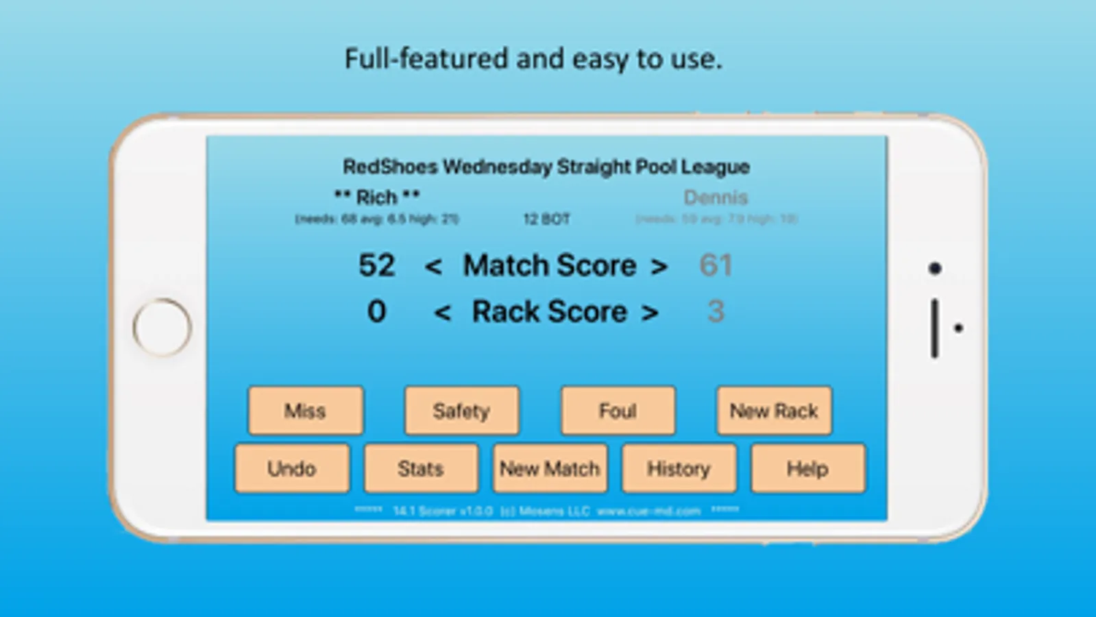Keep an accurate score of your 14.1 Straight Pool matches with the easy-to-use 14.1 Scorer. Tracks safeties, fouls (breaking fouls, three-foul penalties, etc.) and includes an 'On-Two' fouls warning. See your up-to-date current, average, high run and other match stats at-a-glance.