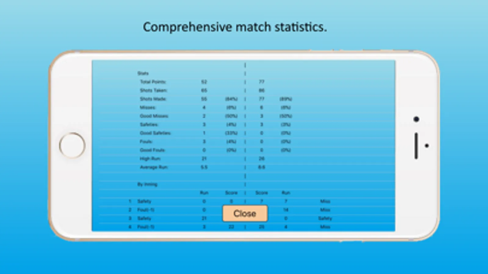 The complete, comprehensive match statistics and inning-by-inning results can be viewed any time and include 'Good' safeties, misses and fouls.