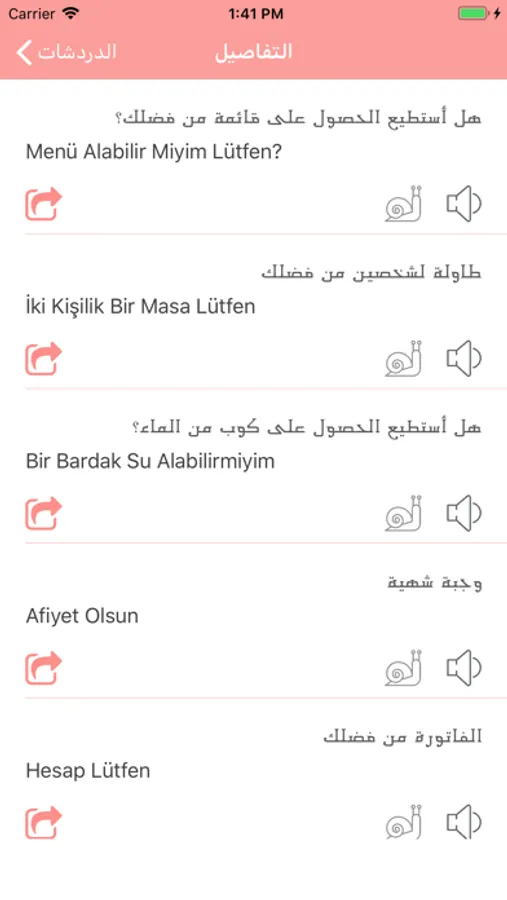 كل كلمة وكل جملة مكتوبة في اللغة التركية وأيضاً مكتوبة في اللغة العربية بحيث تساعد المستخدم في معرفة كيفية نطق الكلمة أو الجملة