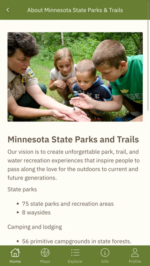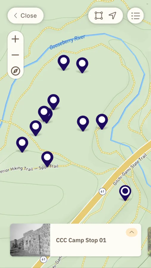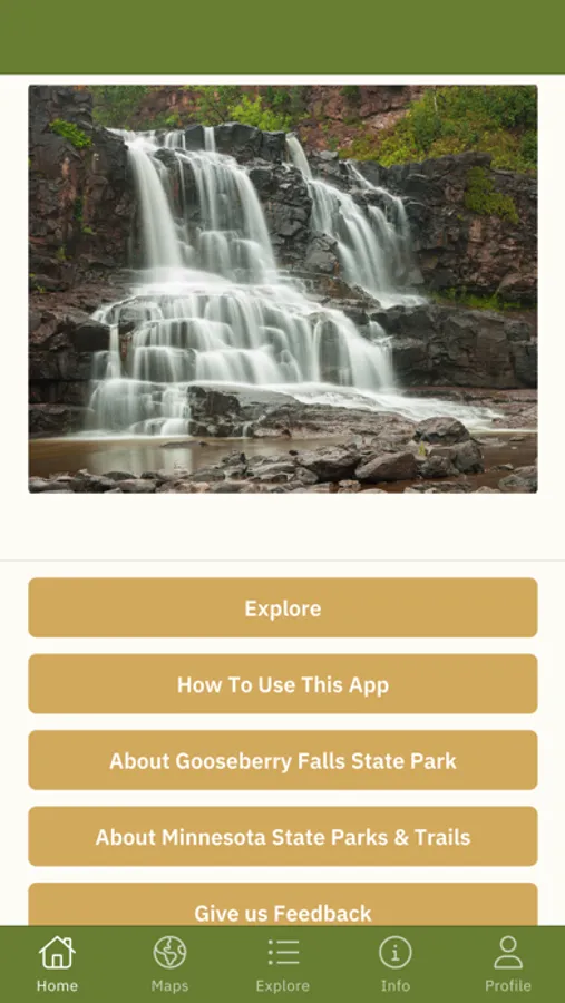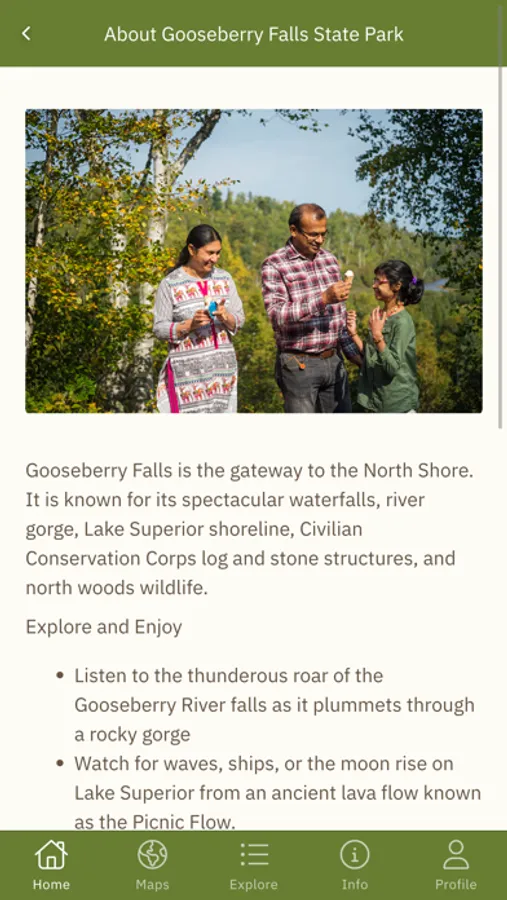 Tour Gooseberry Falls State Park like never before with the Gooseberry Falls Go app. You'll explore multiple scenic routes in the park, go on a photo challenge and learn to identify trees and rocks. Along the way you'll hear the hidden history of the CCC boys who built the state park, discover how those magnificent falls were formed, and dive deeper into the nature that surrounds you. Works offline. Free Wi-Fi available in the Gooseberry Falls Visitor Center for downloading the app.