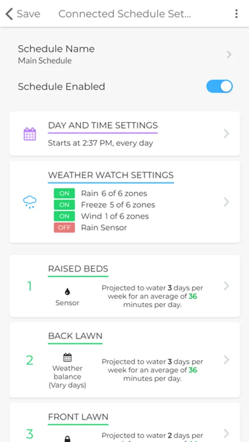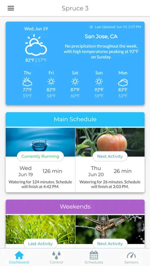 Spruce uses weather data and advanced watering algorithms to water as efficiently as possible. With optional Spruce Soil Moisture Sensors, you'll also know exactly when and how much to water.