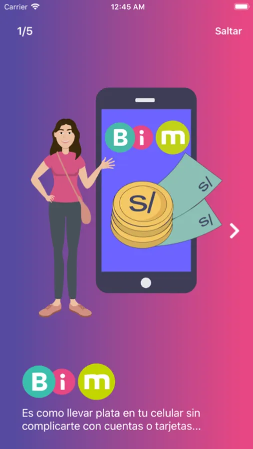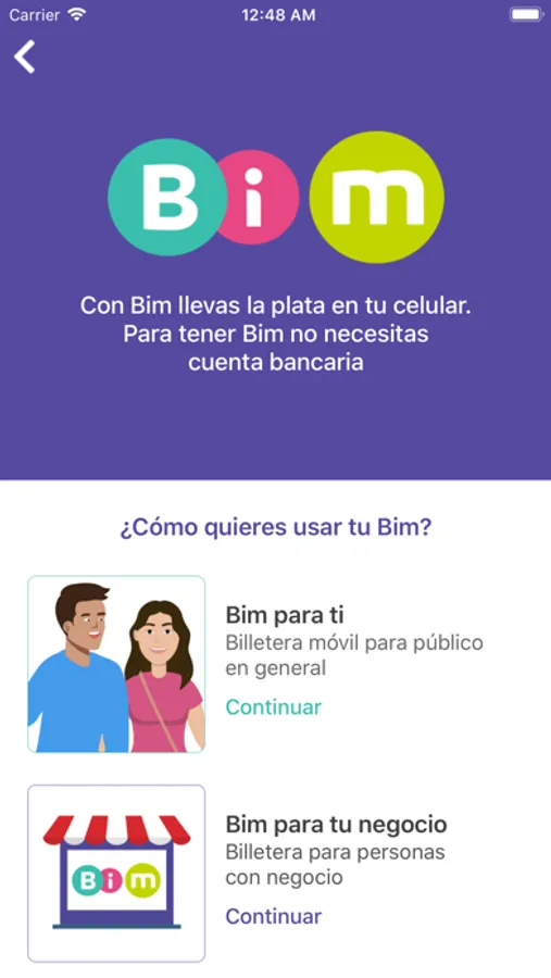 Bim es una Billetera Móvil, es como llevar plata, pero en tu celular. Con Bim no necesitas cargar efectivo, podrás llevar plata de manera segura sin tener monedas o billetes. Es seguro, económico y ahorrarás tiempo. Recuerda, abrir tu Bim es gratis.