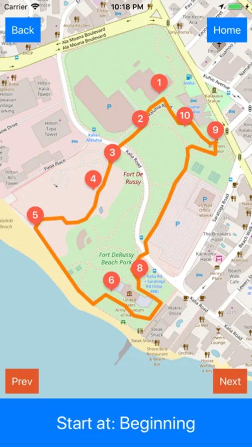 This app guides you through a walking tour of Fort DeRussy in downtown Waikiki. Even without being there, you can see pictures of the various landmarks in Fort DeRussy, and hear a narrated tour.