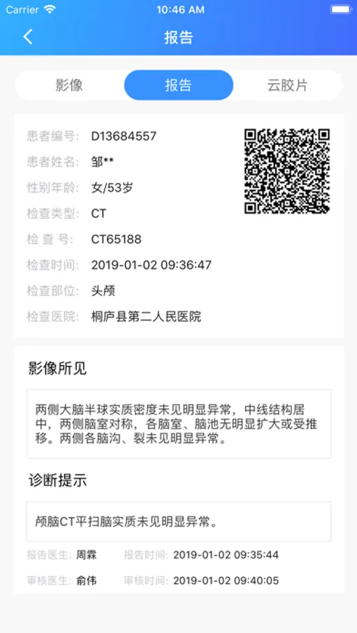 钜典云影像基于互联网+和云计算、大数据技术,打造智慧影像数据平台,进行医疗影像数据的存储、传输、管理及各场景的应用,提升医疗行业的效率,促进医疗资源优化配置,推动医疗事业发展,引领人类进入智慧医疗时代。钜典云影像APP是钜典云影像在移动端的应用,是一款专业的医疗影像查看工具,主要实现远程医疗诊断,跨平台跨终端随时随地查看dicom影像及查看报告,以及其他辅助功能,如通过扫描二维码获取患者数据信息、关注案例等功能。