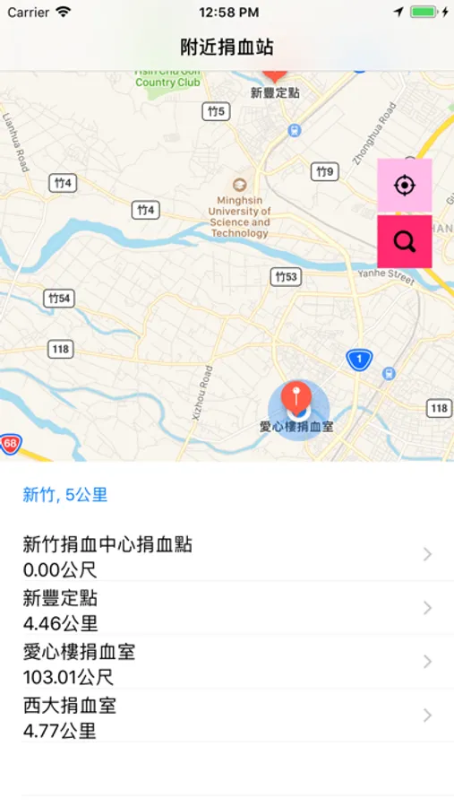 (2) 附近捐血地點查詢並提供導航及撥號功能
