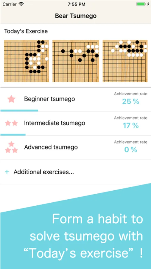 From the viewpoint of an abundant number of exercises, niceness of answers and BearTsumego's unique useful features, we offer the additional exercises at greater price than books.