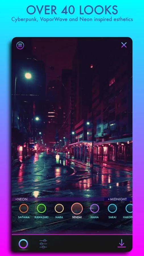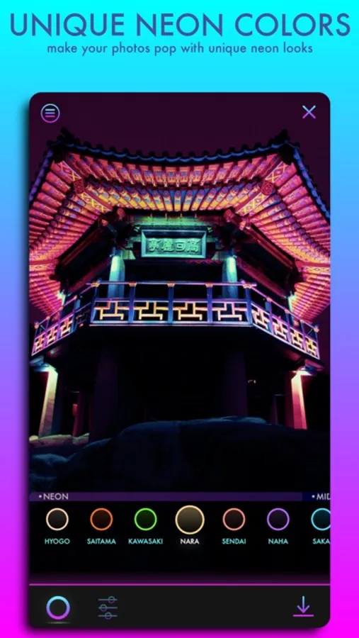 Inspired by the emerging style of Neon, Cyberpunk and VaporWave esthetics, NeonCam gives a unique take on color filtering, allowing you to capture photos and videos that truly stand out.
