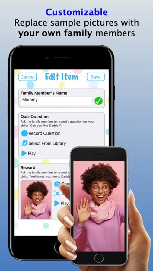 The sample voices, photos and videos provided with the app can be replaced with those of your own family to make a personalised experience. There is also a new topic that helps your children to recognise animals though photos and sounds.