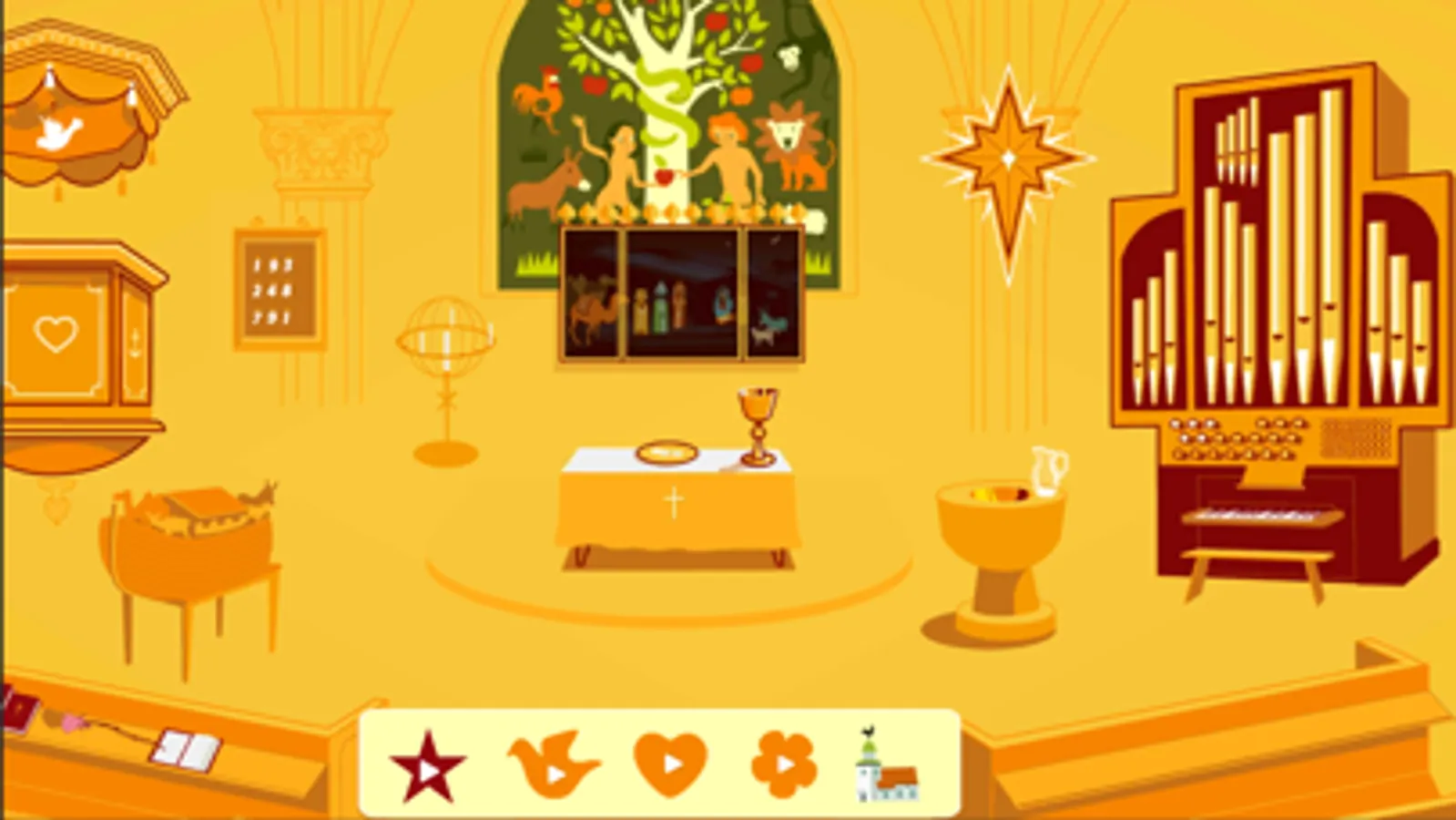 Kyrkan är ett lekfullt spel från Svenska kyrkan. Spelet utgår från kyrkorummet och förmedlar Svenska kyrkans liv, lära och traditioner på ett lekfullt och pedagogiskt sätt. Du kan till exempel måla ett kyrkfönster, hälla vatten i dopfunten, spela på orgeln, tända ett ljus eller spela memory med djuren i Noas ark. På altaret serveras nattvard och oblaten blir till ett pussel med tre olika svårighetsgrader. Altartavlan visar en bild från Jesus födelse där du kan flytta om hur du vill.
