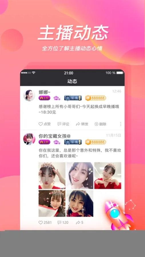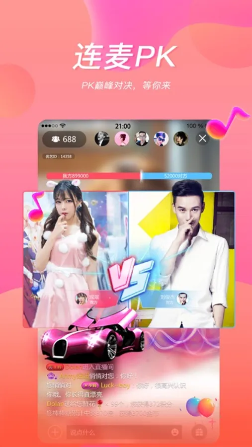 【倾城之恋】炫酷的礼物特效,可以表达浓浓爱意、一见倾心,简爱一生 【连麦PK】24小时直播间、激烈PK排位赛,活动不停,pick你喜欢的主播,赢取专属身份勋章。直播间红包雨,抢到手软