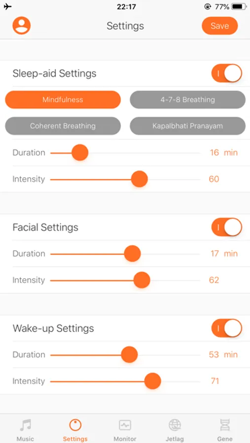 Sleep-aid lighting therapy: Setting up duration and intensity of doctor developed breathing techniques to bring calm and mindfulness.