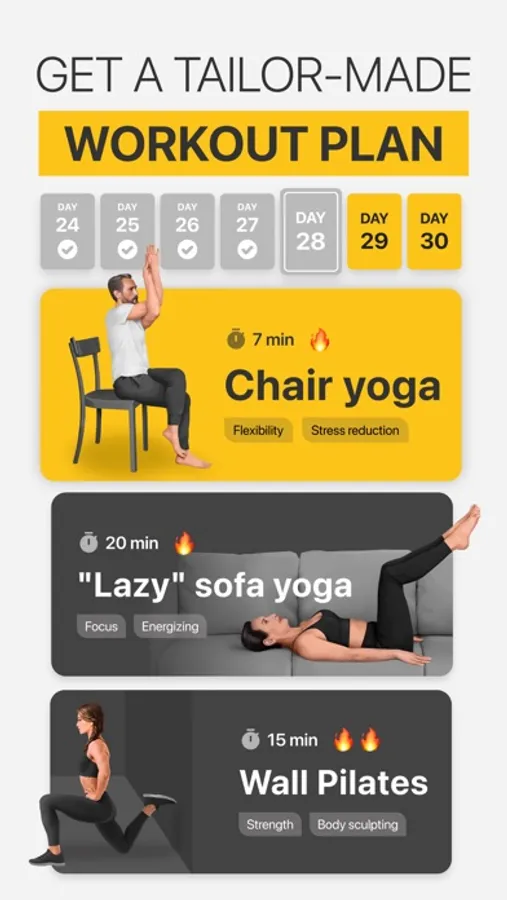 • Get a new practice daily that takes your goals, problem areas, and fitness level into consideration.