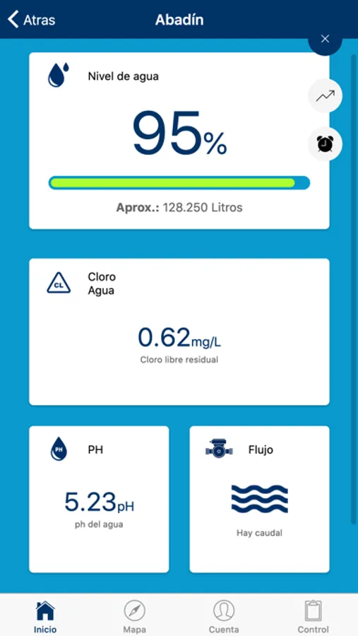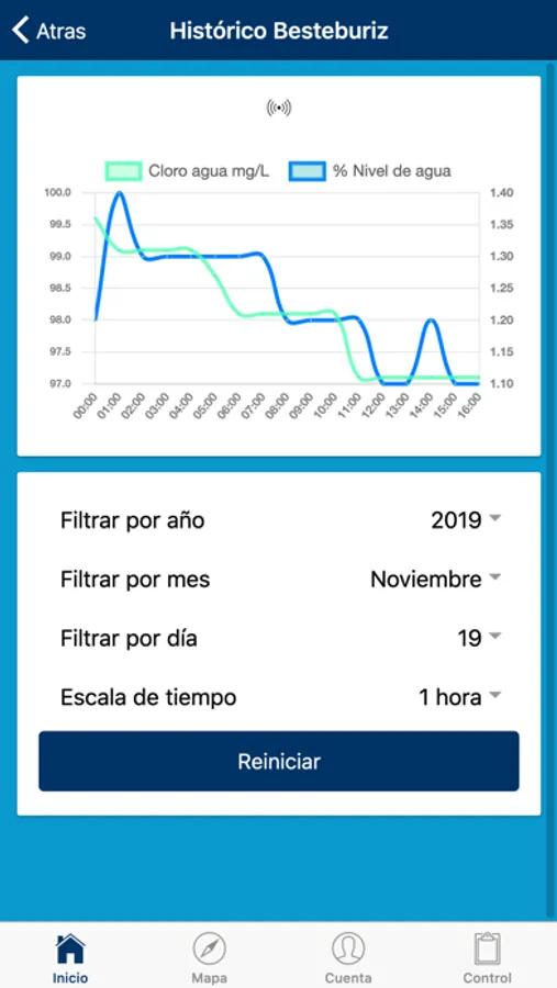 DataWater es una aplicación que complementa un sofisticado sistema de monitorización en tiempo real. Permite visualizar de forma rápida y sencilla el estado actual de los niveles de agua y cloro de uno o varios depósitos. Además puedes usarla como herramienta de análisis estadístico a través de un potente visor de históricos. Cuenta también con un sistema de alarmas instantáneas, que notifican al usuario cuando ocurre un problema, por ejemplo: que el nivel de agua desciende por debajo de un mínimo establecido. A mayores también permite llevar un control centralizado de abastecimientos de agua.