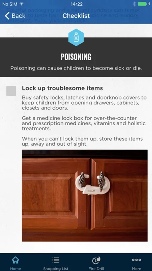 • Keep track of your safety progress with an easy checklist design. From anchoring flat-screen TVs to keeping cosmetics out of reach, this home safety app has you covered.