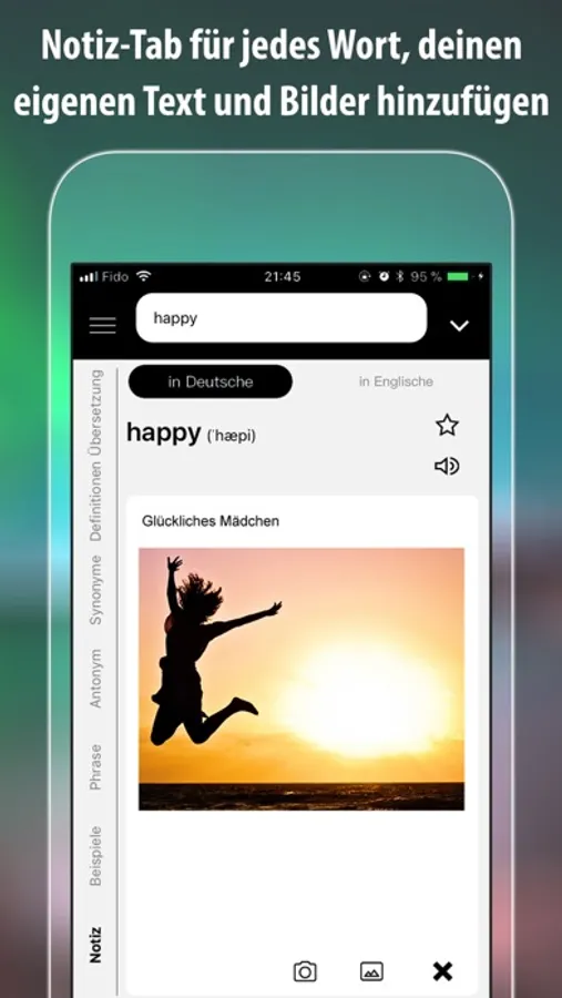 - Notiz-Tab für jedes Wort, so dass du deinen eigenen Text und Bilder hinzufügen kannst