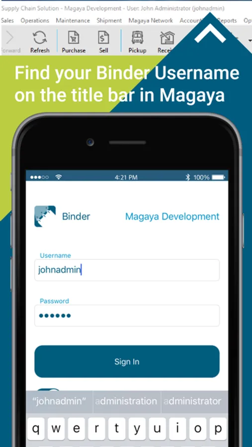 2. Your Binder Username is displayed in parentheses on the title bar in Magaya, for example (johndoe). The Password is the same you use for Magaya.