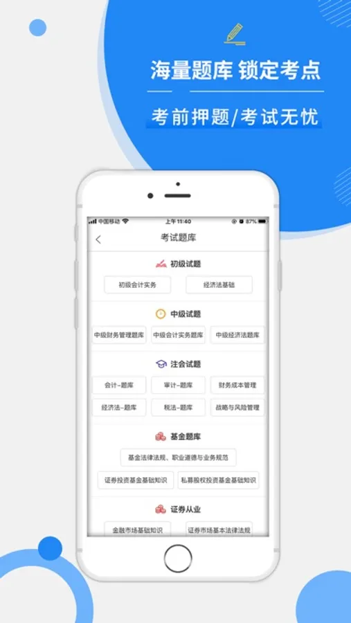 初级会计职称考试题库、中级会计职称考试题库、cpa注册会计师职称考试题库,管理会计师题库、税务师题库、CMA美国管理会计师题库、银行从业资格证题库、证券从业资格证题库、基金从业资格证题库、期货从业资格证题库、会计实操专业能力证书题库等,根据学员需求,准备阶段可选章节练习,考前巩固阶段可选择模拟考试、历年真题,冲刺阶段可选择考前押题密卷。会计考证通关必备刷题神器!