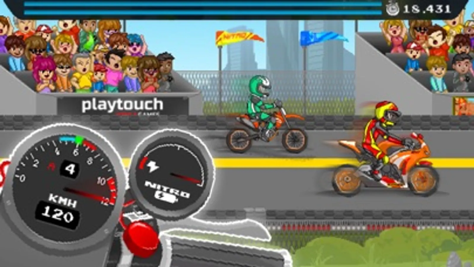 You compete in duel races : 1 versus 1. Your goal is to win the race to go to the next opponent and unlock new motorbikes. This is pretty simple, isn't it ? Ok, but do you really have what it takes to raise this challenge ?