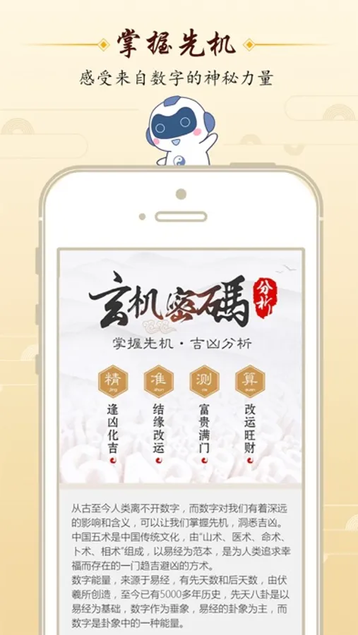 玄机密码APP运用周易64卦,揭开数字号码与人生运势相互关系的玄机密码,通过号码组合来分析你的做事风格、内在福禄、外在环境、环境需求和运势向导,不同的数字组合会带来不一样的效果,玄机密码将告诉你哪些数字能让你财运亨通、事业发达。