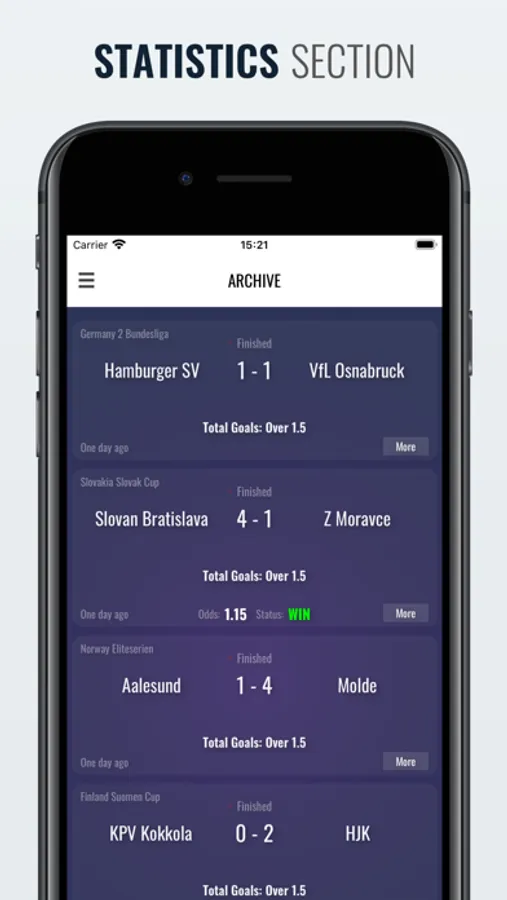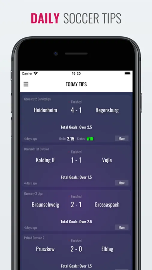 Every match has information about home and away team, local start date and time, match status, match results, type of the tip, publish date and time. Current/recap status of the prediction (Win/Lose) can be viewed by tapping on the more button.