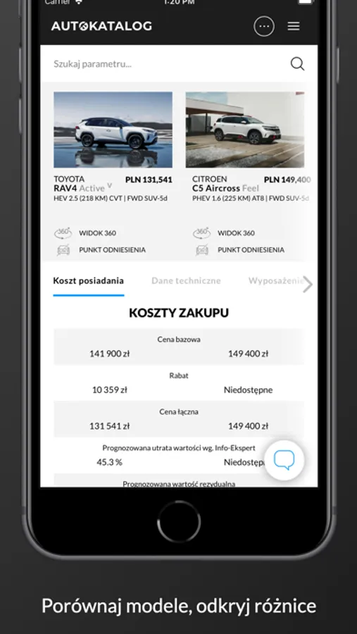 The comparison tools enable to compare up to 10 models and their versions in terms of acquisition and financing costs. They include the residual values for the 5-year period with an assumed mileage of up to 75,000 km, as well as the amount of installments and financing costs. By using the "Reference point" function, they allow you to verify differences in technical data, and after enabling the "Arguments" function, they allow you to find quickly the strengths of models selected for the comparison.