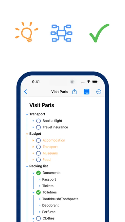 Notes, images, links or tasks, drop them all in a mind map. Start an outline for an organized, structured view, and switch to mind map to visually rearrange ideas or add new ones.