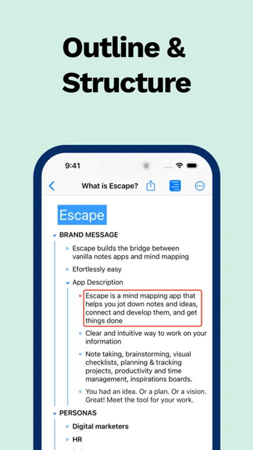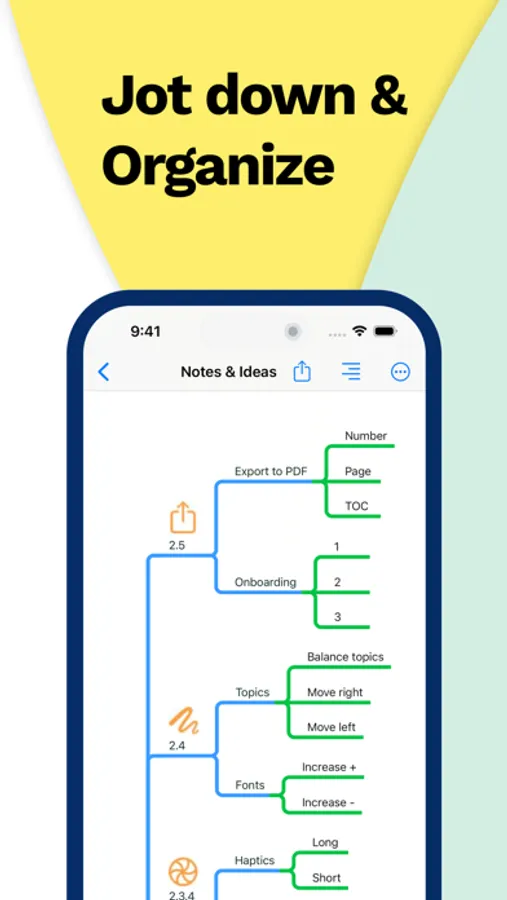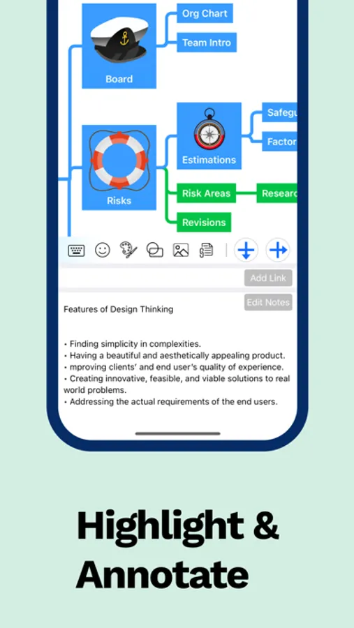 Information is ever changing and your app should help you stay on top of things. Rearrange, edit, merge or highlight with intuitive gestures. Instantly switch between outline and mind map. Focus on details by unfolding branches.