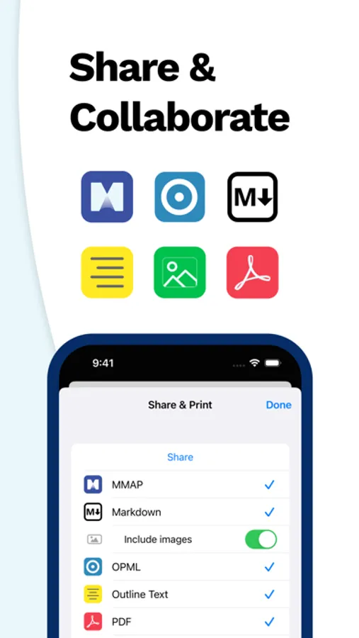 Easily share your maps with others as image, text, PDF or MMAP. Collaborate on tasks with non-mind mapping users, by exporting the map as PDF with clickable checkboxes.