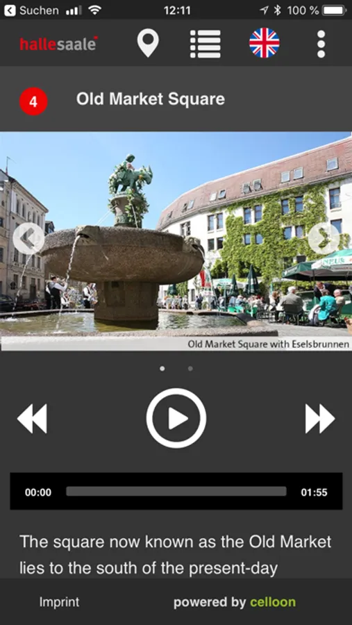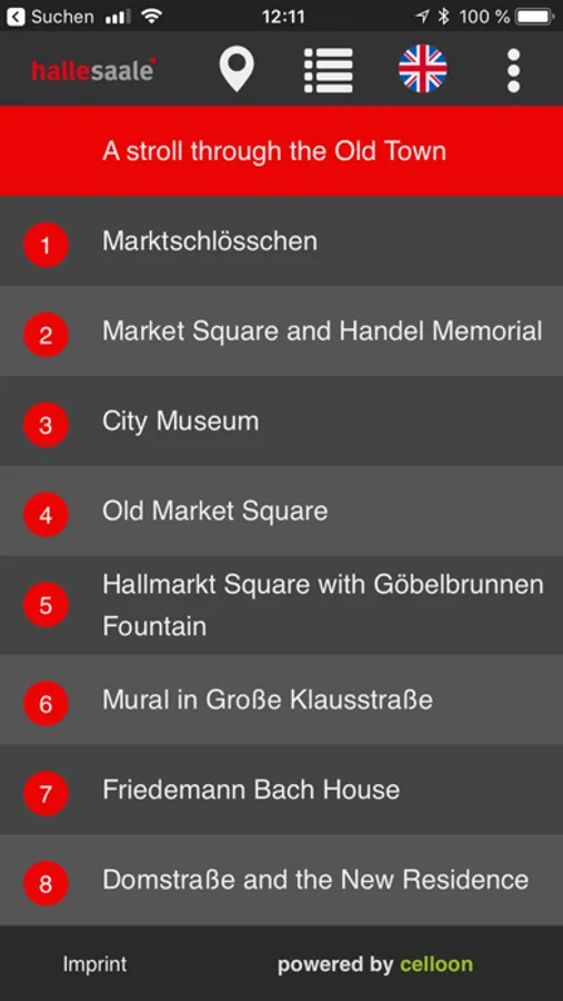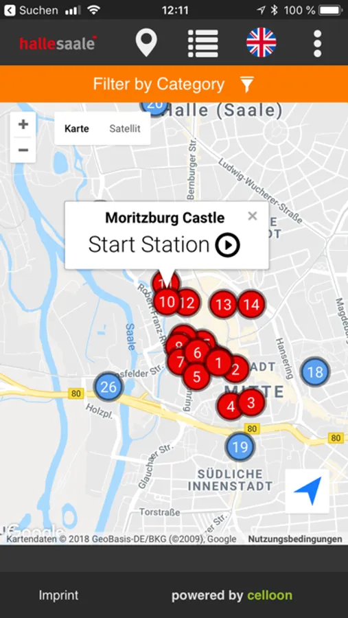 By pressing "Start tour", you will be taken on a tour around Halle’s town centre. The tour comprises 16 stations and will last around 60 to 90 minutes. There are also another 9 bonus stations awaiting you. These stations are located slightly outside the town centre and not all of them are within walking distance. The audio volume can be adjusted using the volume buttons on your smartphone.