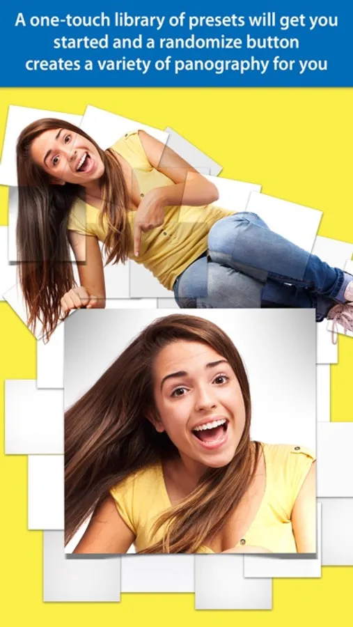 Panographic Photo comes with a library of one-touch presets to get you started, and a randomize button that auto generates a variety of panography by pushing it over and over to get something fabulous. Each composition can then be customized by moving, rotating and scaling the photo tiles—the sky is the limit in what can be done!