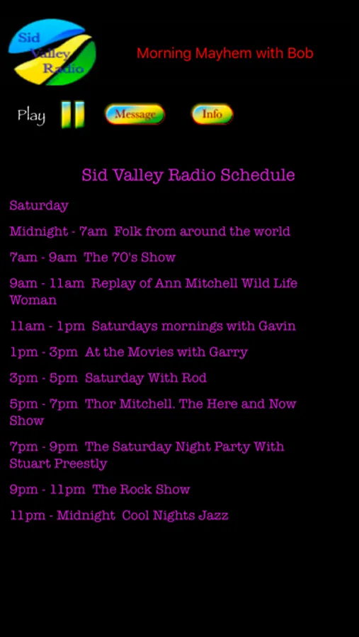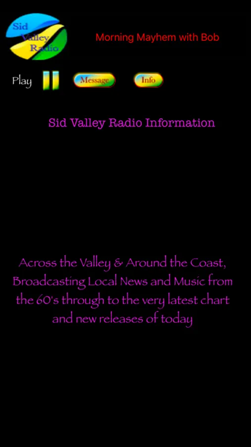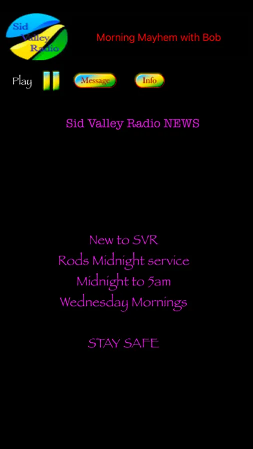 This app will connect to the live Sid Valley Radio Stream, playing music from yesterday to today. The App can run in the background once the stream is active.