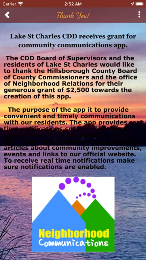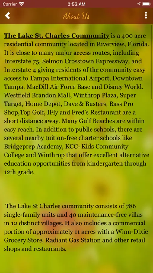 Community based Information such as meetings, management contact information, notifications, web site links, current development updates and events for residents of the Lake St Charles community located in, Riverview, Florida.