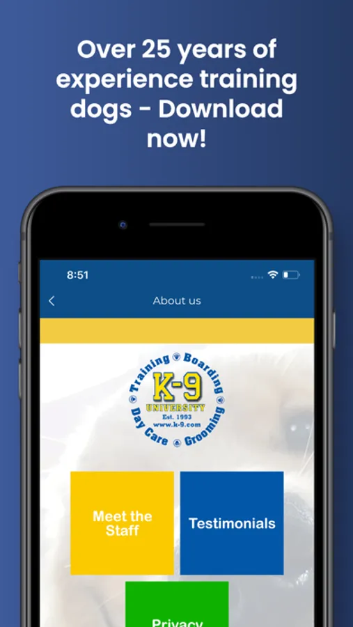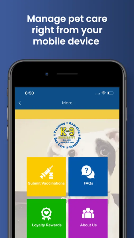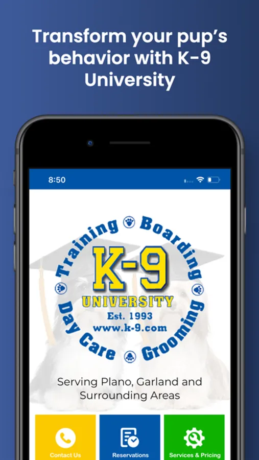 Welcome to K-9 University’s mobile app. Download our app and have instant access to all the information you need to manage your pet’s training, boarding, daycare, and grooming needs right from the convenience of your mobile device.