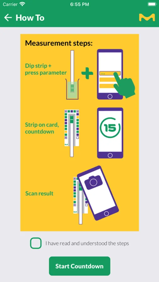 The app guides through the measurement process, determines the measurement result by camera, and saves and visualizes measurements automatically.