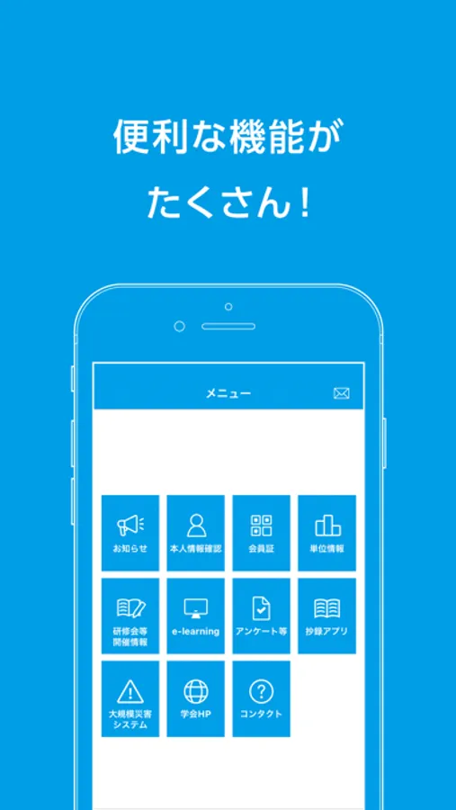 デジタル会員証、会員ポータルサイトメニュー、学術講演会 抄録集などをアプリ1つで利用できます。
