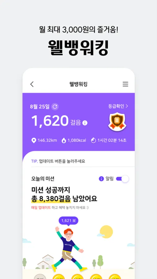 수신고객대상은 걸으면 매일 최대 40원, 매월 최대 1,240원의 혜택을 드려요