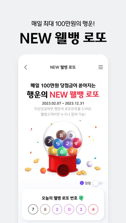 · 웰뱅로또 : 0부터 9까지 숫자 6개 맞히면 상금을 드려요