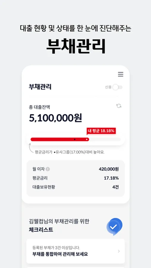 모든 부채를 모아서 관리해드리며 갈아타기 대출이 가능한지 알려드려요 이자절감 프로젝트에 참여해보세요